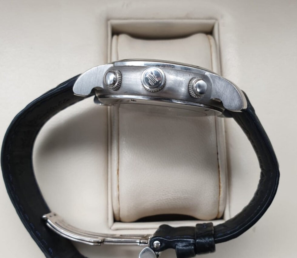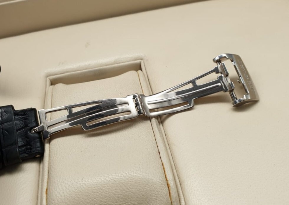 Preowned – 25866PT.O.D002CR.01 Audemars Piguet. This watch features a 42mm platinum case with a polished platinum fixed bezel. It has a white dial with silver-tone index hour markers and white gold hour and minute hands. It has various sub-dials for day of the week and 30-minute counter at 3 o’clock, month indicator and leap year indicators at 6 o’clock, date indicator and small seconds indicator at 9 o’clock, and moonphase and week of the year indicator at 12 o’clock. It is powered by a self-winding mechanical movement, Calibre Audemars Piguet 2885, with a power reserve of approximately 50 hours. The case thickness is 13.2mm and has a solid case back with a sapphire crystal front. The watch has functions including a perpetual calendar, date, weekday indicator, month indicator, moon phase indicator, repeater, chronograph, hours, minutes, and central second hand. It comes with a black alligator leather strap with a platinum deployant buckle and is water-resistant up to 30 meters.