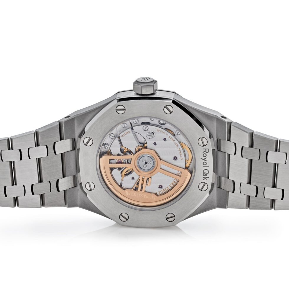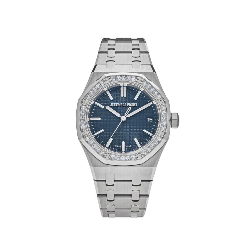 This Royal Oak Selfwinding is crafted in a 37mm stainless steel case with a bezel set with brilliant-cut diamonds. The blue dial features the ‘Grande Tapisserie’ pattern, white gold applied hour-markers and Royal Oak hands with luminescent coating. The watch comes on a stainless steel bracelet with AP folding clasp.