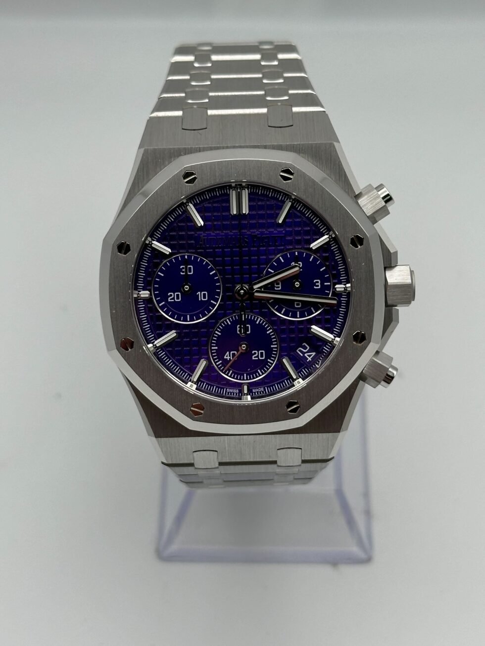 The Audemars Piguet Royal Oak Selfwinding Chronograph 26240BC.OO.1320BC.01. The 41mm case is made of 18k white gold and complements the Grande Tapisserie dial in royal purple. Luminescent white gold hand and hour markers work with the Sapphire glare-proofed crystal for optimal legibility in any condition. An exhibition case back gives a glimpse at the Calibre 4401 in action, powering all of the watch’s complications, including Flyback chronograph timekeeping and date features.