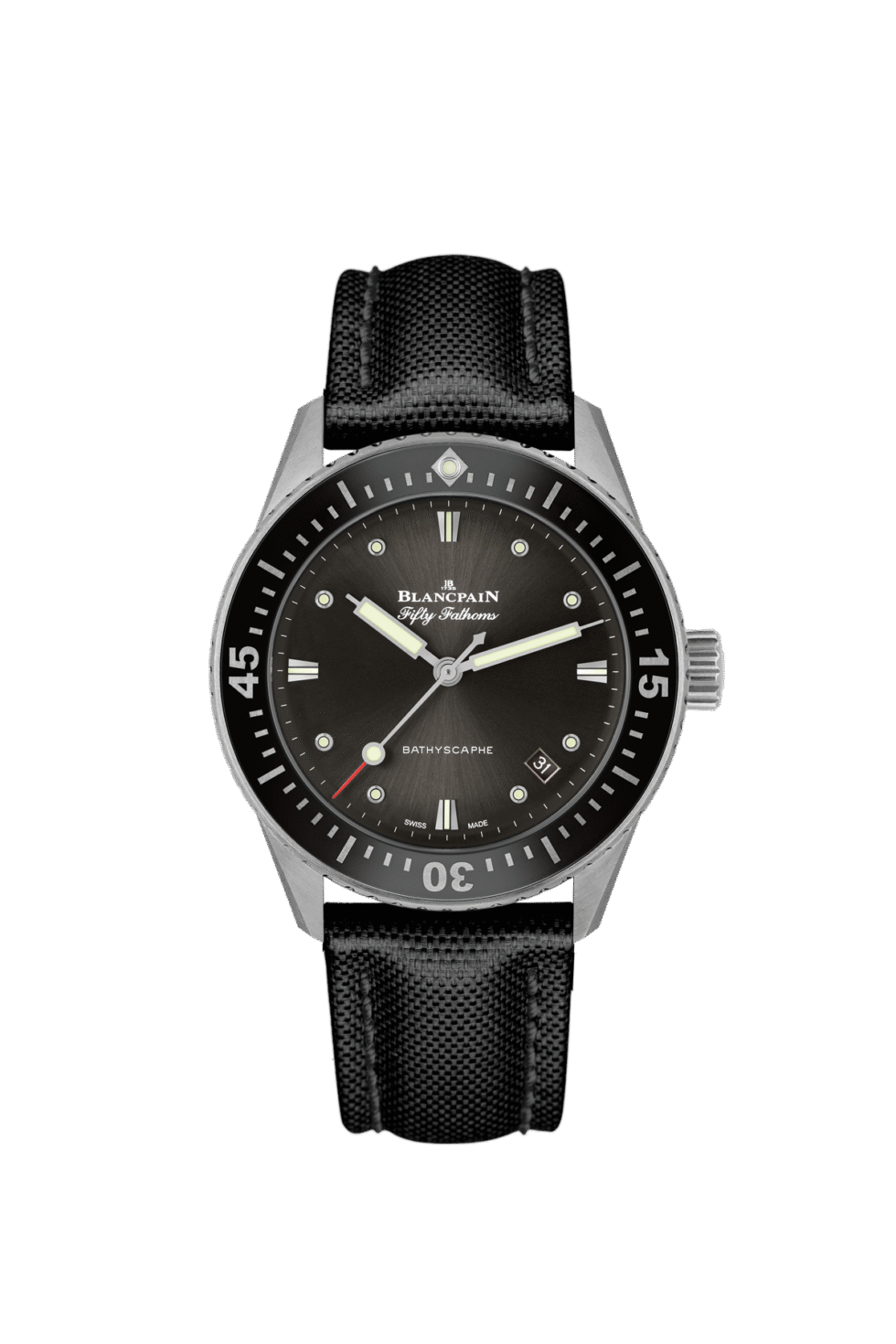 Blancpain Fifty Fathoms Bathyscaphe 5100B 1110 B52A The Blancpain Fifty Fathoms Bathyscaphe 5100B 1110 B52A is a men’s watch that features a 38mm steel case and is powered by the Blancpain Caliber 1150 automatic movement. The watch comes with a sail-canvas strap and pin buckle. It has a water resistance rating of up to 30 bar, which is equivalent to a depth of approximately 300 meters or 1000 feet. The Fifty Fathoms Bathyscaphe is a modern interpretation of the original Fifty Fathoms watch that was designed for the French Navy’s elite combat divers in the 1950s. The Bathyscaphe model is known for its sleek, minimalist design and its impressive technical specifications, which make it a popular choice for professional divers and watch enthusiasts alike. The Blancpain Caliber 1150 movement is a self-winding movement that features a 100-hour power reserve and a silicon hairspring for enhanced accuracy and durability. The sail-canvas strap is a durable and comfortable choice that is often preferred by divers and outdoor enthusiasts. The pin buckle is easy to use and secure, ensuring that the watch stays in place during even the most intense activities. Overall, the Blancpain Fifty Fathoms Bathyscaphe 5100B 1110 B52A is a high-quality, stylish, and functional watch that is perfect for men who love adventure and the great outdoors. With its impressive water resistance rating and durable materials, it is a watch that can handle almost any activity or environment.