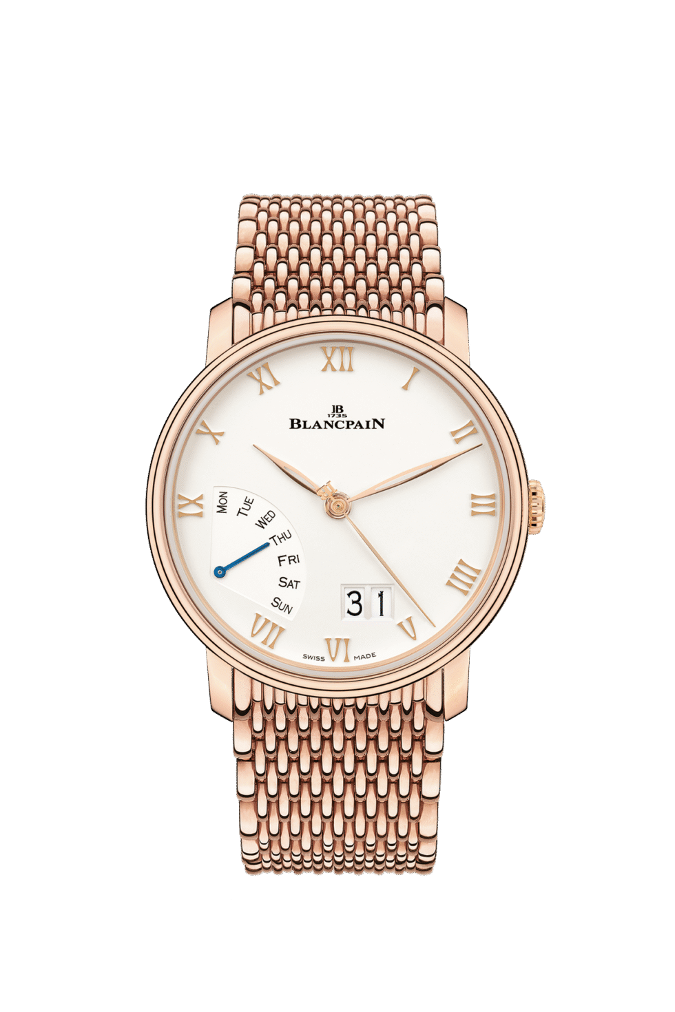 Blancpain Villeret Grande Date Jour Rétrograde 6668 3642 MMB The Blancpain Villeret Grande Date Jour Rétrograde 6668 3642 MMB Men’s watch is a luxurious timepiece that showcases the brand’s technical prowess and attention to detail. The watch features a 40.5mm Red Gold case, a high-quality material known for its durability and luxurious aesthetic. The case houses the 6950GJ.4 caliber, a self-winding mechanical movement that powers the watch’s functions. One of the notable features of this watch is its Grande Date Jour Rétrograde complication, which displays the date and day of the week in large format at the top of the dial. The retrograde display means that the hand jumps back to the beginning of the scale at the end of each week, adding a touch of visual interest to the watch. The watch comes with a Mille Mailles bracelet and a Mille Mailles bracelet with a Folding clasp. The Mille Mailles bracelet is a high-end metal bracelet with a woven mesh design that adds to the watch’s luxurious aesthetic. The folding clasp provides added security and convenience, allowing the wearer to easily adjust the bracelet to their desired fit. The watch has a water resistance rating of 3 bar, which means it can withstand splashes of water but should not be worn while swimming or diving. It is important to note that water resistance ratings are not equivalent to water depth ratings, and care should be taken to avoid exposing the watch to water beyond its rated capacity. Overall, the Blancpain Villeret Grande Date Jour Rétrograde 6668 3642 MMB Men’s watch is a high-end timepiece that combines technical innovation with luxurious design and materials. It is a statement watch that is sure to impress both collectors and enthusiasts alike.