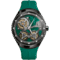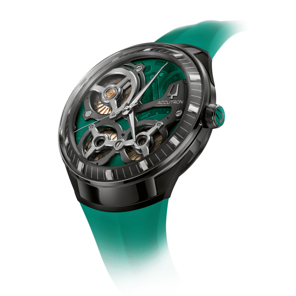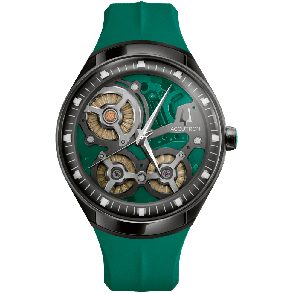 Signature Accutron green accents on the outer minute ring. Green color open-work dial and polished silver-tone hands.