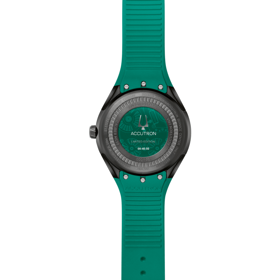 Stainless steel case in combo silver-tone and grey finish with stamped Accutron logo and turbine design on the green case back.