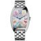 Stainless Steel. Hand polished. Water resistant up to 30 meters. Rhodium plating. Width: 29 mm x Length: 39 mm x Thickness: 6 mm. Sapphire crystal Hours, Minutes Crown with 2 positions: 1. On. 2. Time Setting MVT FM 2750-QZ. Quartz movement. Battery life of 3 years. 5 Rubies. Diameter: 17.50 mm. Thickness 2.75 mm. Quartz frequency at 32’768 Hz Cotes de Geneve and sunray brushing on the casing ring Stainless Steel Bracelet. Hand polished. Stamped guilloche with sun pattern. 20 Layers of translucent lacquer. Color Dreams numbers meticulously painted by hand