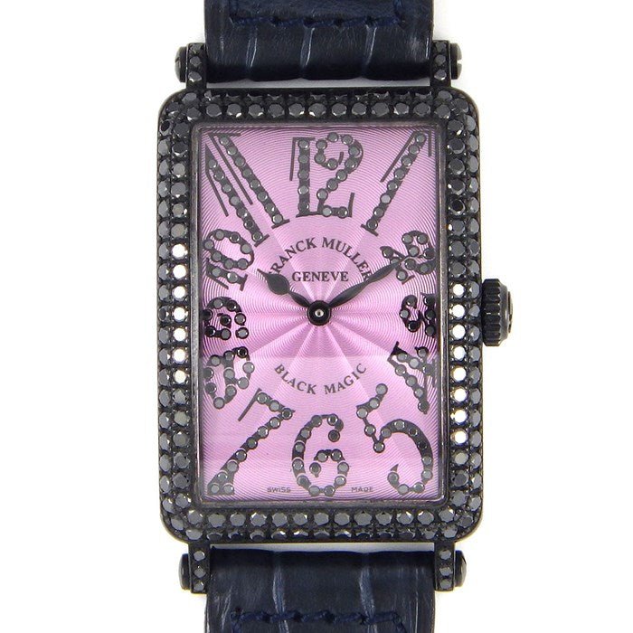 902QZDBLACK Franck Muller. The Franck Muller Long Island Black Magic 902QZDBLACK is a stunning and elegant lady’s watch that epitomizes both style and sophistication. The watch features a sleek 40.15 x 22.9 mm black leather strap, which adds a sense of luxury and refinement to the overall design. The fixed, diamond-set black bezel enhances the watch’s glamour, adding a touch of sparkle and elegance. The pink dial, adorned with Arabic numeral hour markers and black hands, creates a striking contrast, allowing for easy reading and a touch of femininity. This timepiece operates on a precise quartz movement, ensuring accurate timekeeping. The scratch-resistant sapphire crystal protects the dial, preserving its clarity and beauty. The watch features a solid case back, adding to its durability and sophistication. With a case size of 40.15 x 22.9 mm and a sleek rectangle case shape, the watch exudes a sense of modernity and sophistication. Its functions are focused on providing the essentials of timekeeping: hours and minutes. The Franck Muller Long Island Black Magic 902QZDBLACK is a luxury watch that effortlessly combines style and function, making it a perfect accessory for the modern woman who appreciates both elegance and precision.