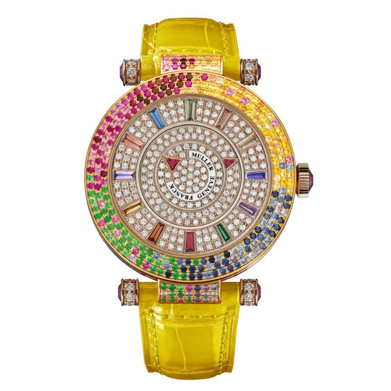 Round Case. Double Mystery – Four Seasons. 18k Rose Gold. Hand polished. Water resistant up to 30 meters. Diameter: 42 mm x Thickness: 10.1 mm. Sapphire crystal. Hand set with 152 brilliant-cut diamonds (1.92 carats) and 249 brilliant-cut colored. sapphires and tsavorites (3.66 carats) Hours, Minutes Winding shaft with 2 positions: 1.Winding. 2.Time setting MVD FM 2800-MY. Self-winding movement with bidirectional rotor system. Power reserve of 42 hours. 217 Components. 21 Jewels. Diameter: 26.20 mm. Thickness : 5.35 mm. Balance wheel frequency set at 28,800 alternations per hour Cotes de Geneve and brushing ”soleil papier” on the bridges and the rotor. Circular graining on the two sides of the main plate. Chamfering of the bridges. 24k Gold bath and rhodium plating of the components. 24k Gold finish on the written engravings. Circular brushing of the rotor ball bearing.