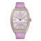 Vanguard Case. 18k Rose Gold. Hand polished. Water resistant up to 30 meters. Hand set with 300 brilliant-cut diamonds (3.78 carats). Width: 32 mm x Length: 42.3 mm x Thickness: 9.9 mm. Pink inserts on both sides of the case. Sapphire crystal Hours, Minutes Winding shaft with 2 positions: 1.Marche. 2.Time setting MVT FM 1321-QZ. Quartz movement. Battery life of about 4 years. 27 Components. 7 Jewels. Width: 9.00 mm. Length: 13.20 mm. Thickness: 2.10 mm . Quartz frequency set at 32,768 alternations per hour Cotes de Geneve and circular graining on the casing ring . 24k Gold finish on the written engravings and rhodium plating Hand sewn alligator strap 18k Rose Gold buckle. Hand set with 12 brilliant-cut diamonds (0.21 carats). Hand polished Stamped guilloche with sun pattern. 20 Layers of translucent lacquer. Applique numerals meticulously painted and applied by hand
