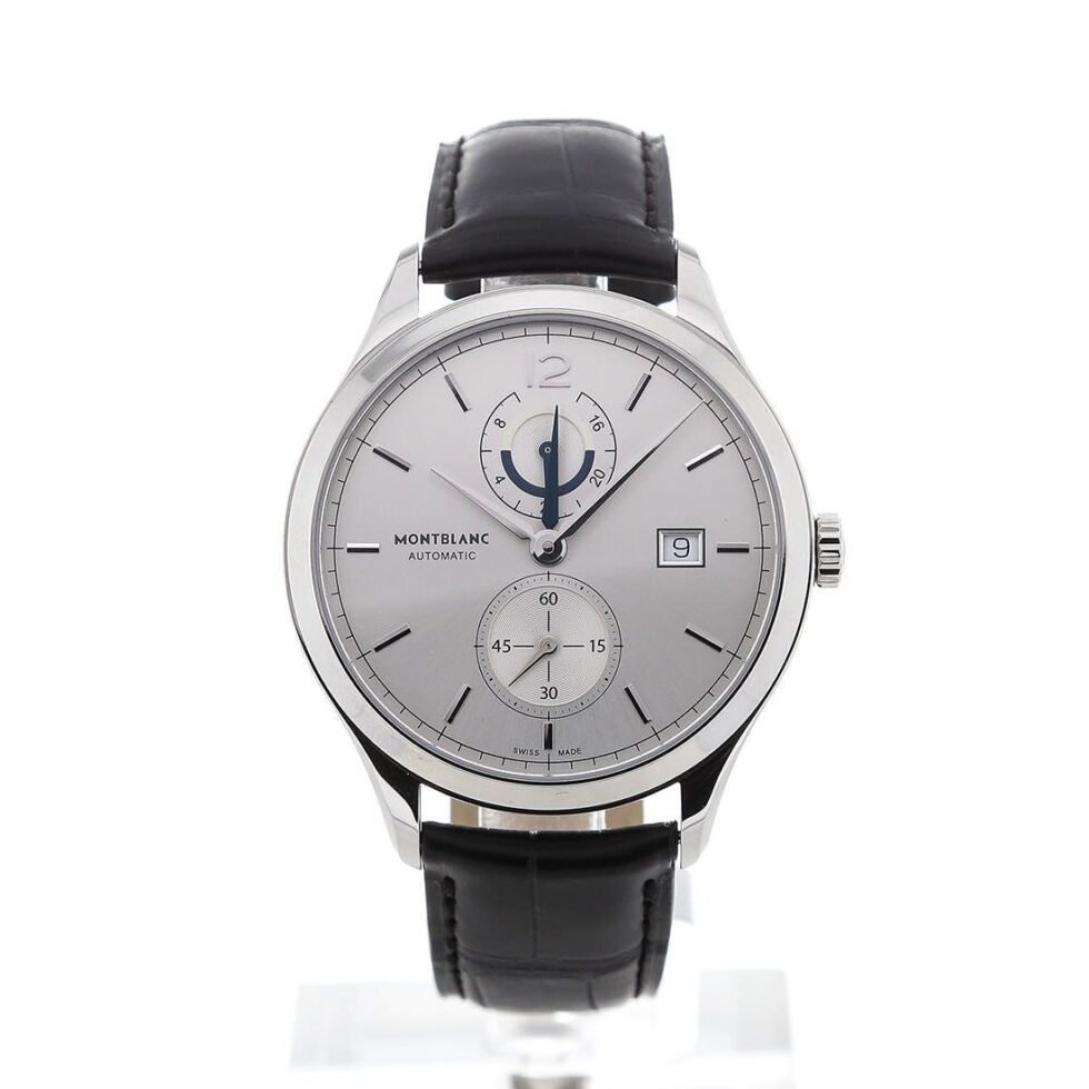 112540 MontBlanc. The MontBlanc Heritage Chronometrie Dual Time 112540 is a distinguished men’s watch that combines timeless design with modern functionality. The watch features a 43 mm stainless steel case, providing durability and a classic appearance. The black (alligator) leather strap complements the overall elegance of the timepiece. The fixed stainless steel bezel adds to the refined look of the watch. The silver dial is adorned with silver-tone hands, index hour markers, and an Arabic numeral at the 12 o’clock position. Minute markers are present around the outer rim, enhancing readability. In terms of functionality, the watch offers a dual time feature, indicated by two sub-dials displaying 60 seconds and 24 hours, providing practicality for travelers or individuals needing to track different time zones. The date display is positioned at the 3 o’clock position. The watch is powered by an automatic movement, ensuring accurate timekeeping, with a power reserve of approximately 42 hours. The scratch-resistant sapphire crystal protects the dial from scratches and adds to the durability of the watch. The transparent case back allows you to admire the inner workings of the automatic movement. With a water resistance of up to 30 meters (100 feet), this watch is suitable for daily wear and can withstand occasional exposure to water. The MontBlanc Heritage Chronometrie Dual Time 112540 is a luxury watch that blends classic design with modern features, making it a stylish and functional choice for individuals seeking sophistication and versatility.