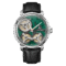 Green dial treatment with transparent outer ring. Light green super luminous markers, white hour and minute hands and orange second hand.