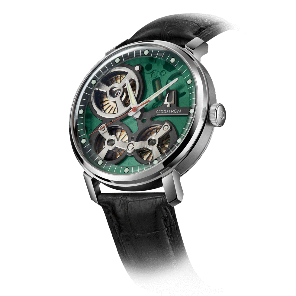 Accutron’s Proprietary Electrostatic Movement. The electrostatic energy is created by twin turbines that rotate as a result of human motion at incredible speeds between two electrodes affixed to the movement. The energy, stored in an accumulator, powers two motors; a world’s first electrostatic motor fueling the fluid second hand and a step motor powering the hour and minute hands.