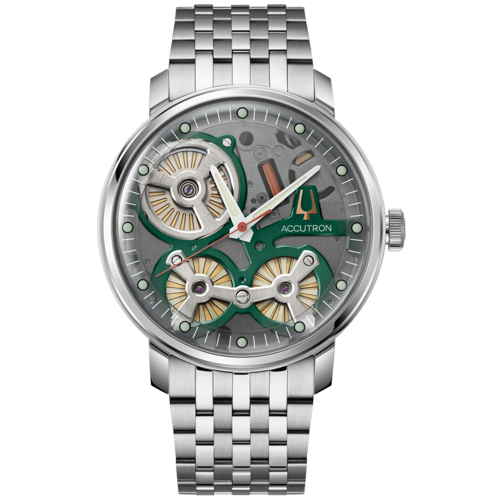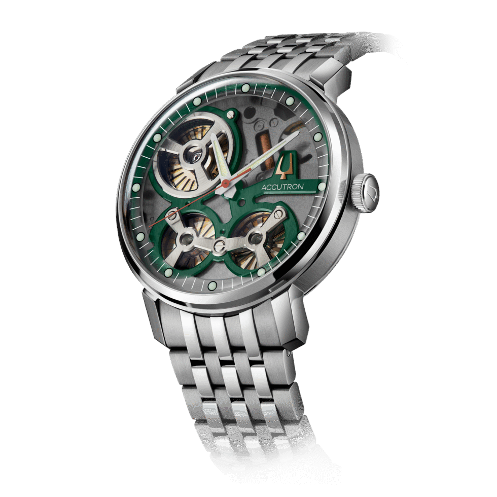 Smoke grey open-work dial with signature Accutron green accents and transparent outer ring. Light green super luminous markers, white hour and minute hands and orange second hand.