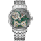Accutron’s Proprietary Electrostatic Movement. The electrostatic energy is created by twin turbines that rotate as a result of human motion at incredible speeds between two electrodes affixed to the movement. The energy, stored in an accumulator, powers two motors; a world’s first electrostatic motor fueling the fluid second hand and a step motor powering the hour and minute hands.